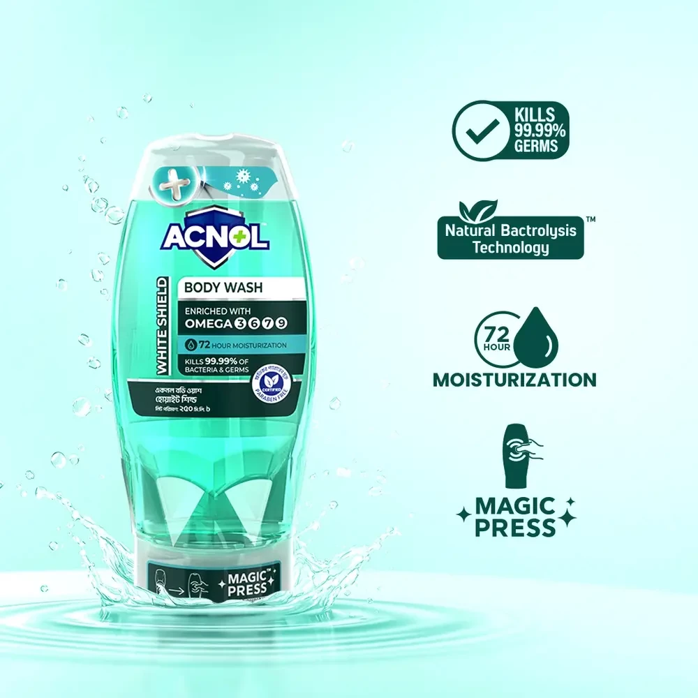 Acnol Multifunctional Hygiene Body Wash - White Shield offers the ultimate cleansing experience with advanced protection, leaving your skin feeling refreshed and nourished. Enriched with Omega Plus, this body wash provides essential moisture and shields your skin from harmful bacteria, delivering 360-degree protection. Ideal for daily use, its pH-balanced formula ensures optimal care for your skin while a refreshing fragrance enhances your shower experience.